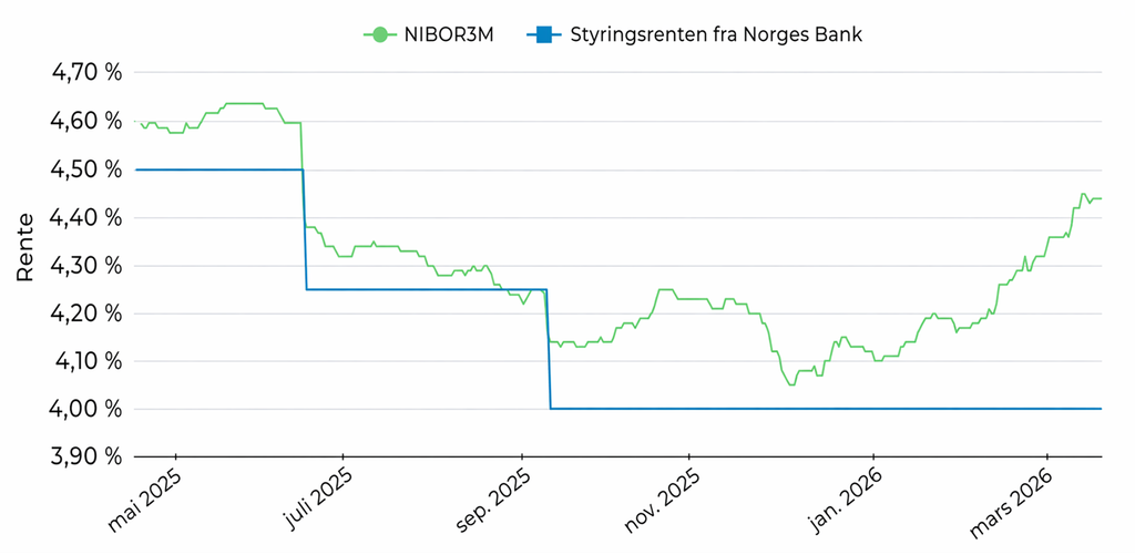 Så langt i 2026 har tremåneders pengemarkedsrente (NIBOR 3M) steget fra 4,07 % til 4,44 % – en oppgang på 37 basispunkter på under fire måneder (per 21.4.26) - se grafen under. Oppgangen skyldes høye inflasjonstall, som har medført at Norges Bank har varslet at de trolig vil sette opp styringsrenten «på et av de nærmeste rentemøtene».