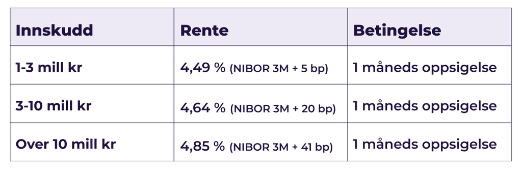 I Fixrate har bedriften fått en rente på NIBOR 3M pluss 40 basispunkter, som det siste året innebærer en gjennomsnittlig innskuddsrente på 4,7 %. Her må du akseptere 31 dagers oppsigelsestid.
