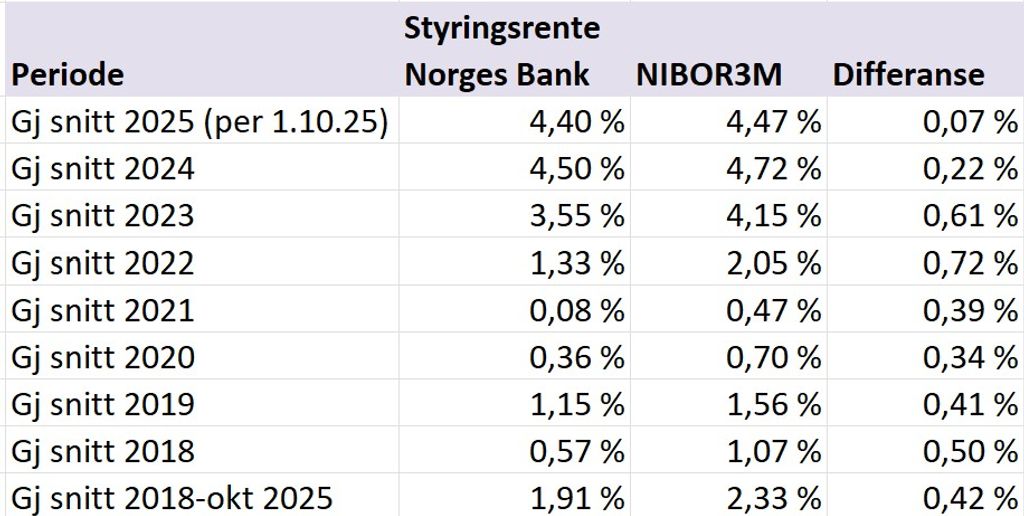 I skrivende stund ligger NIBOR3M på 4,13 %. Differansen ned til styringsrenten på 4,0 % er lave 13 basispunkter. Dette er vesentlig under det historiske gjennomsnittet siden 2018, som er på rundt 40 basispunkter, som det fremgår av tabellen under. (Kilde tabell: NoRe og Fixrate.)