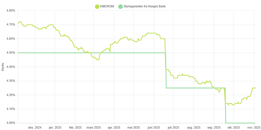 I løpet av oktober steg NIBOR3M pengemarkedsrente fra 4,13 % til 4,25 %. Se graf under, som viser NIBOR3M (lysegrønn linje) og styringsrenten fra Norges Bank (mørkere grønn linje) siste 12 måneder. Denne grafen finner våre kunder alltid oppdatert på innlogget side under "Analyse" i venstre marg.