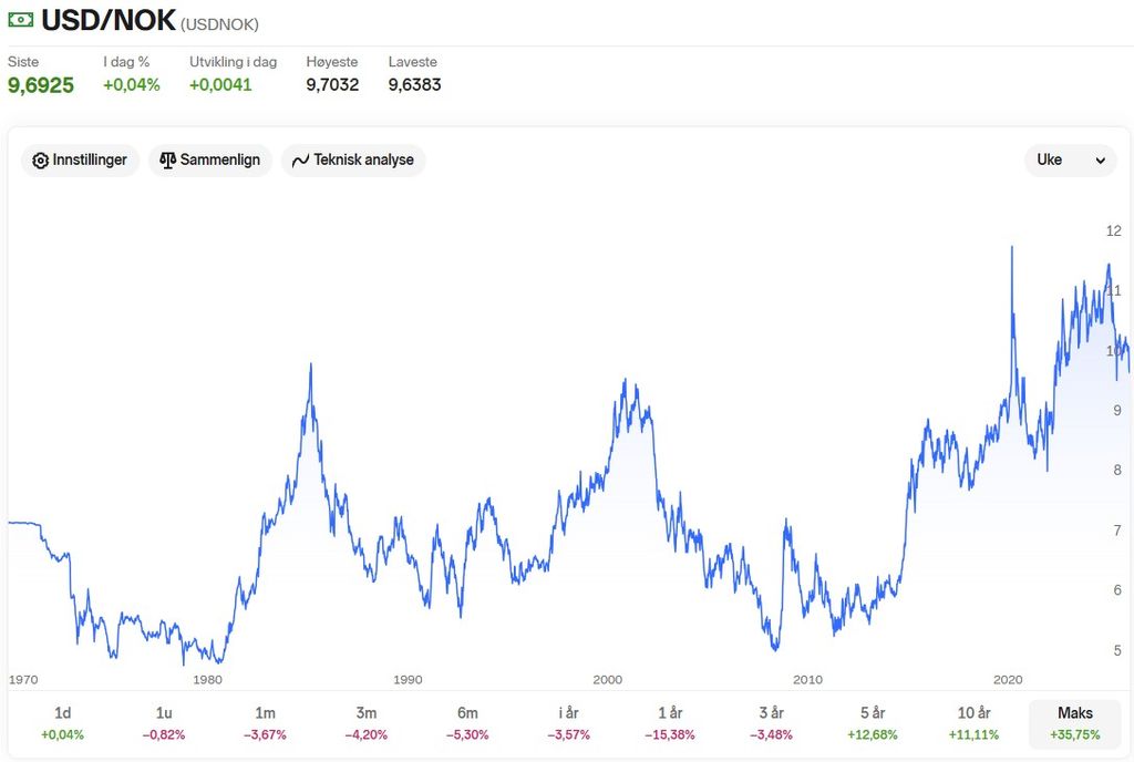 Den blå linjen i grafen over viser USD/NOK kursen fra 1970 og frem til i dag. En dollarkurs på 5-tallet var normalen i perioden 1973-1982 og 2007-2013. Siden den gang har den tydelige trenden vært svakere krone – helt frem til januar 2025, og innsettelsen av Trump som president. (Kilde graf: Nordnet.)