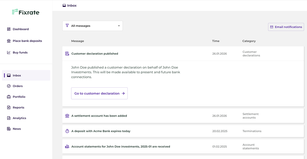 I Fixrate får både banken og kunden en “innboks”. Her finner de alle innkommende meldinger.